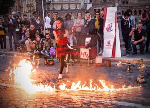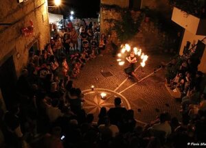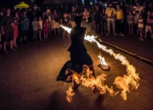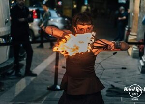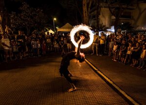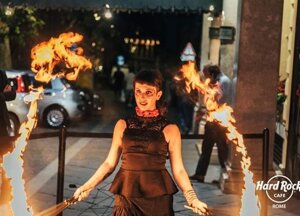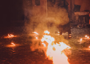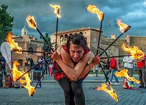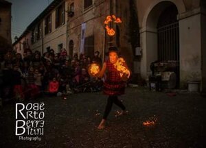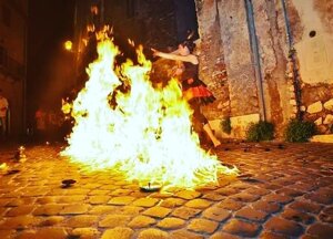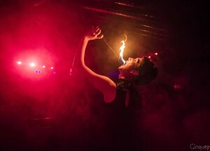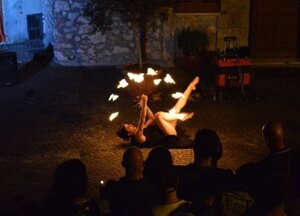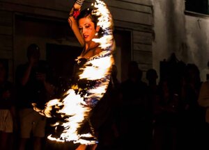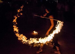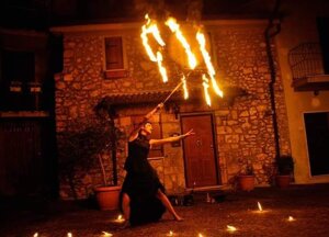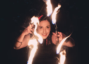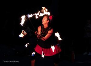 Il fuoco, principale attore, viene coinvolto e manipolato attraverso diverse forme grazie all’uso di molteplici attrezzi: coppe, bolas, ventagli ed ombrello, per finire con il celeberrimo salto della corda infuocata, un cordone di due metri puramente in kevlar, per dar dimostrazione della sua leggiadria e maestria nel manipolare l’elemento che più la rappresenta.
